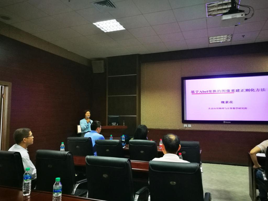 魏素花研究员从X-射线成像方式及用途出发,讲解了X-射线成像的物理过程,着重介绍了团队在基于Abel变换的层析成像方面所做的研究工作;提出基于TV和四阶拉普拉斯混合正则化的去噪模型,将ALM应用于求解该模型,并对数值结果进行了详细介绍。会后,魏素花研究员与在场师生进行了交流与探讨。(文/图 田伟)