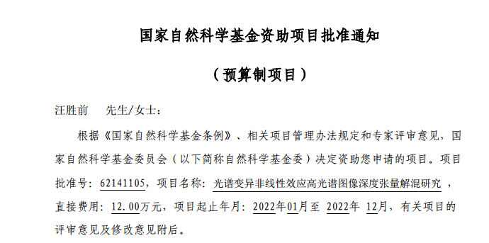近日,国家自然科学基金委公布了2021年度国家自然科学基金专项项目评审结果,实验室主任汪胜前教授申报的“光谱变异非线性效应高光谱