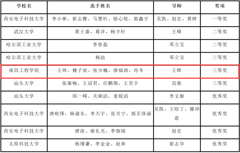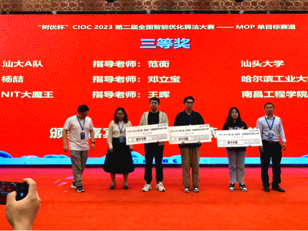 近日,第二届“树优杯”CIOC全国智能算法大赛在湖南张家界圆满落下帷幕。在重点实验室王晖教授的带领和指导下,由重点实验室电子信息专业研究生组成的“NIT大魔王”队(参赛队员:王帅 魏子宸 张少巍 廖福涛 肖东)经过初赛和决赛,最终在多目标优化赛道上取得了全国三等奖的优异成绩。