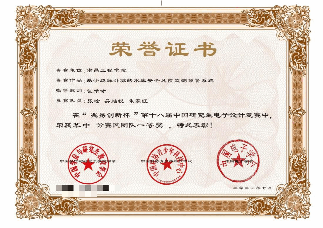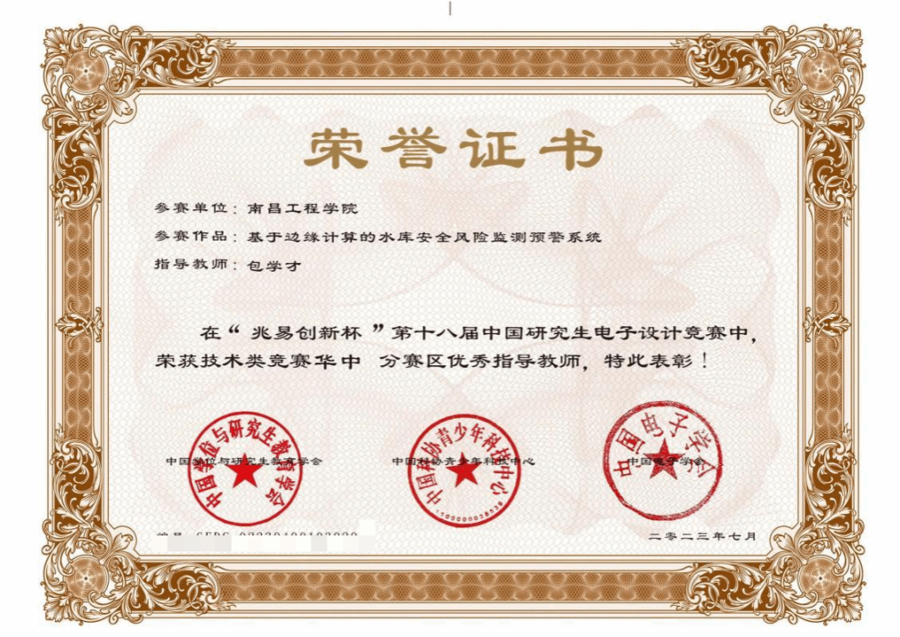 近日,由教育部学位管理与研究生教育司指导,中国电子学会、中国学位与研究生教育学会、中国科协青少年科技中心共同主办的“兆易创新杯”第十八届中国研究生电子设计竞赛华中赛区决赛在江西省南昌航空大学举行。由重点实验室包学才教授指导,2021级电子信息专业张晗、吴灿锐和朱家旺3名研究生共同完成的“基于边缘计算的水库安全风险监测预警系统”项目荣获技术竞赛组华中赛区一等奖,包学才被评“优秀指导教师”,这是我校首次组织学生参加此次赛事并获得佳绩。